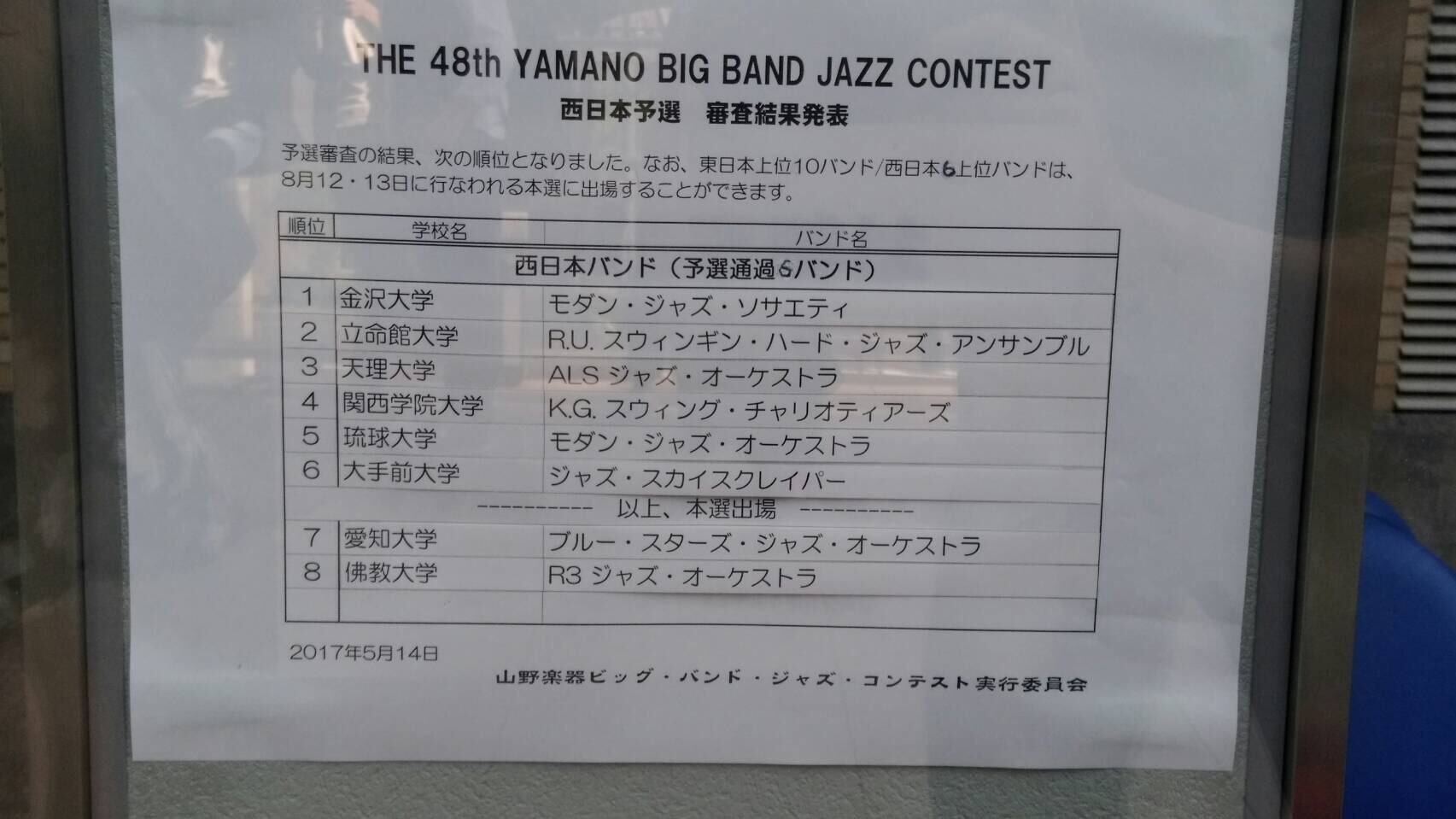 ブログ更新、大変遅くなってしまい申し訳ありません!バシバシドラムを叩きつつも、今年はバンドマスターとMCを務めております、窪龍樹です!ジャズスカイスクレイパー2017が始動してから約4ヶ月経ちましたが、既に内外合わせて10個のイベントで演奏させて頂きました。毎年多くの演奏の機会を頂き、そしてたくさんの方々に聞いて頂き本当にありがとうございます!そんな多忙なジャズスカイスクレイパーの一年の中でも最重要イベントの1つと言っても過言ではないイベントがありました。山野Bigband Jazz Contest(予選)です!!!!!西日本予選は去年と同じく天王寺にある阿倍野区民センターで行われ、全8大学が出場しました。今年も朝からスタジオで最終確認をしてから向かいました! いつも通りに見える人もいれば、朝からガチガチに緊張する人もいたりと様々でしたが、ステージ袖に移動する前はみんな顔が固まってました。笑どんな状態であれ、やはり本番前は緊張してしまいますね〜しかし!本番ではメンバー一同、精一杯演奏できました!結果は6位でした!!今年も本選出場できます!!!! (あえてのチョイス)本選出場枠が6つだったので、本当にギリギリ………というのが正直な感想でした。今回は予選前に二回の本番で予選曲を演奏し、原曲を演奏したbigbandに所属されていた方にご指導して頂いたりと、かなり準備を重ねて来たのですが、それらを経験して見えてきたものは、純粋に自分達に足りないモノでした。しかし、逆にそこまで突き詰めたからこそ見えてきたものがあるし、さらに突き詰めたらまだまだ先が見えてきて、さらにバンドとして成長していける可能性が秘められているという事を思い知りました。予選を終えて、改めてバンドとしての自分達のサウンドや得意分野、個人としてのサウンドや得意分野が見えてきたのではないかと僕は思います。これから本選に向けて、改めて自分達の実力を見直し、メンバー全員で堂々と、全力の演奏をできるようにこれから精進していきたいと思いますので、これからも応援よろしくお願い致します!!!ところでですよ、みなさん。みなさん!!!!!!お気付きの方もいらっしゃると思いますが、今年の山野本選出場はですね、なんと、、なんとですね、、ジャズスカイスクレイパー創立以来、初の2年連続出場なんです!!!!!しかもですね、今年の会場は目ん玉飛び出るくらいすごい所です。なんと、、!!!あの東京JAZZの会場でもある、東京国際フォーラムです!!!もちろん一番広いホール!!!!去年から路線を変えつつ、改めてジャズスカイスクレイパーのサウンドを見直し、突き詰めた結果が出てきてるのではないかと思います。この機会を大事に、大事にして次に繋げられるように頑張っていきます!!!そんな予選終わりのジャズスカイスクレイパーは、来週日曜に毎年恒例のお楽しみイベントがございます。今年は会場も元通り大阪城野外音楽堂で、ゲストバンドはもちろん、関西の学バンが集まります!そう!!!きました!!!大阪城ジャズフェスティバルです!! 6/10,11の両日、今年は昼過ぎから始まります!雨天決行です!チケットは一日券が1000円になっております。ぜひ、ウチのメンバーからお買い求めくださいませ!!笑概要やスケジュール等は大阪城ジャズフェスティバルのTwitterアカウント、もしくはHPの方をご覧ください!https://osakajo-jazzfestival.jimdo.com/%E9%96%8B%E5%82%AC%E6%A6%82%E8%A6%812017/以上、ドラムの窪龍樹でした!!次は美人副部長のあんぬです!