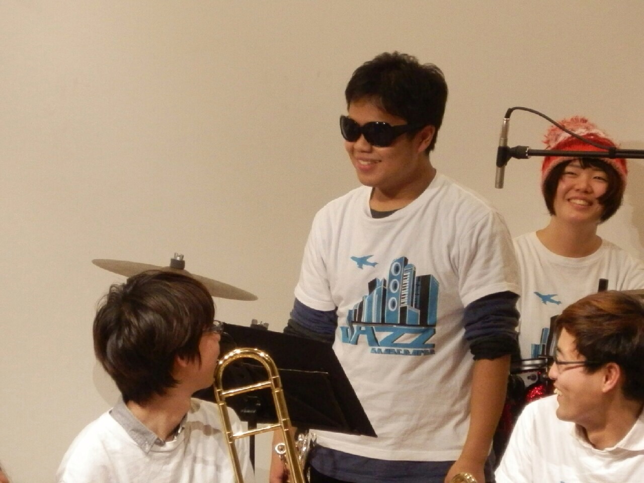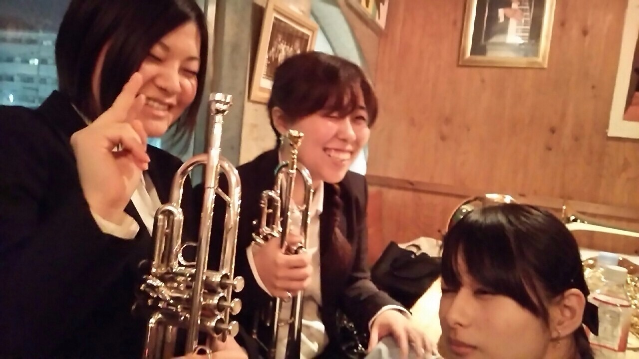 一週間ぶりです!滑舌悪いキャラ担当のしょーちゃんです!最近、短い記事やライブレポートが続いておりましたので、ここでメンバー紹介でもしようかな、と思い立ちました!!!僕自身はトロンボーンパートなのですが、トランペットパートの紹介をしようかなと思います!まずは、一人目、、、〔lead trumpet〕ざきです! ※黒人ではない今年ニ回生のピチピチ笑のトランペッターです!僕と彼は高校からの同期で5年目の付き合いです。彼はノリがよく温和な性格で、いつもアルカイックスマイルで皆のことを見守っています。そんな彼のプレイやハイトーンが聞きたいという方は是非ライブに足をお運びください!続いて〔2nd trumpet〕蛇ちゃん! 写真の一番右の彼女です!彼女は今年の1月に入ってきた新米ですが、それを感じさせないほどの実力!そしてなによりも練習熱心!ぜひ今後のライブでも注目してみてください!〔3rd trumpet〕 トミー 彼は今年からc軍メンバーです。なんといっても喋らせると面白い!まあ内容も面白いのですが、何を喋っているかほとんどわからないところが面白いですね笑でもそんな彼は豆知識豊富でなるほどーと思うことをたくさん話してくれます。〔4th trumpet〕まいちゃん 写真からわかる通りずっとこんなことをやってます!彼女の面白さはjazz研一ではないでしょうか。そんな彼女は会計係を務めてくれており、かげながらJAZZ研を支えてくれているうちの一人です。とこんな感じでメンバー紹介を終えたいと思います!おそらく不定期で更新していくと思うのでおたのしみに!!!!次は、エンターテイナーまいちゃんです!!!!